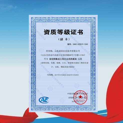 公司獲得中國音像協(xié)會音視頻工程專業(yè)委員會頒發(fā)的《音視頻集成工程企業(yè)資質(zhì)貳級》證書,成為省內(nèi)首批通過該權(quán)威機構(gòu)認證的二級資質(zhì)企業(yè)。
